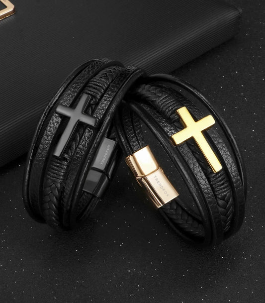 Leren Armband met Kruis - Zwart met Goud Kleurige Sluiting
