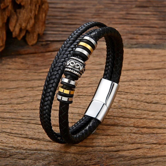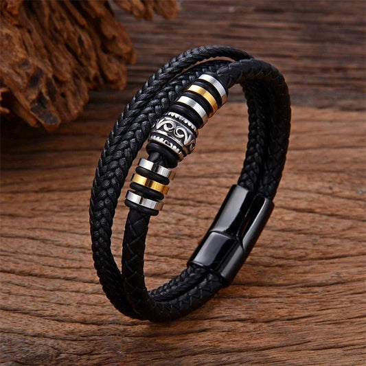 Leren Armband met Vlecht en Accenten - Zwart met Goud