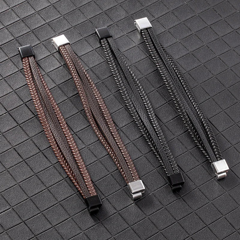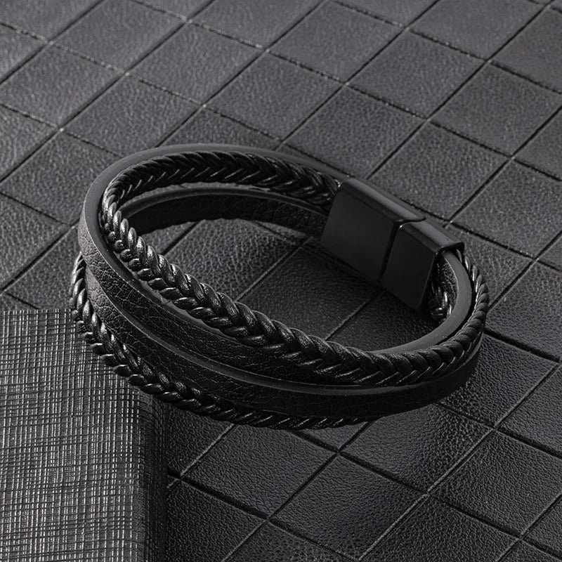 Leren Armband met Dubbele Vlecht - Zwart met Zwarte Sluiting