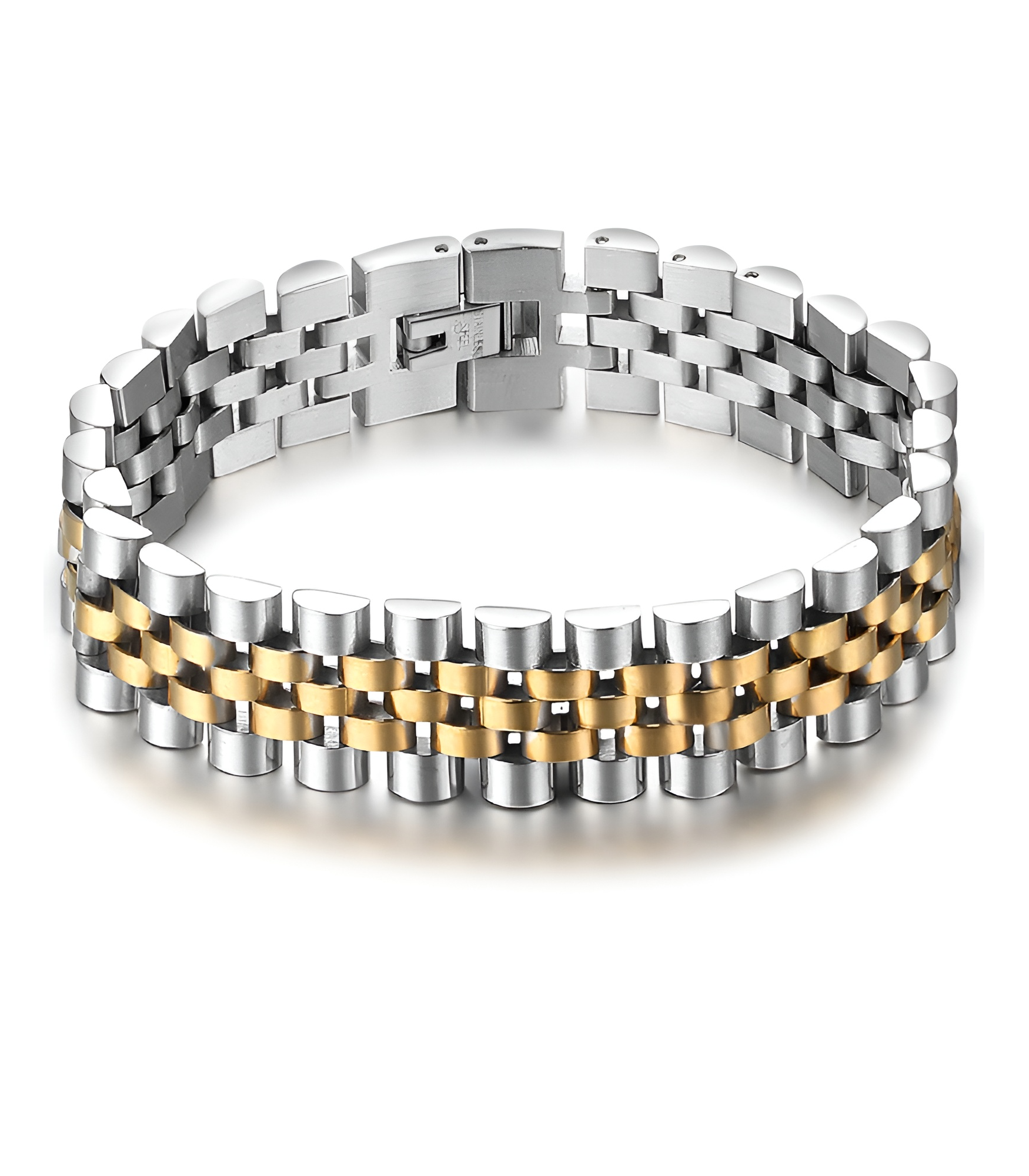Gave armband in de stijl van het bekende horlogemerk met de kroon. Geen zware klok om je pols maar wel een gave look, of juist om je matchende horloge te complimenteren. Strakke stalen constructie met schakels die lekker vloeiend om je pols vormen. Een absolute blikvanger!