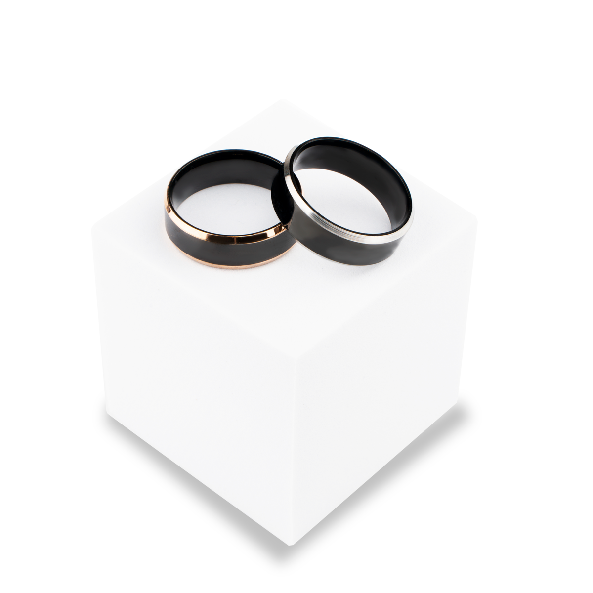 Minimalistische heren ring met zilver kleurige randjes. Door de wisselende afwerking van geborstelde zwarte oppervlakte en gepolijste, goud kleurige randjes onstaat een prachtig contrast voor een blikvangend resultaat. Daarnaast is ook de binnenkant gepolijst voor een comfortabele pasvorm.